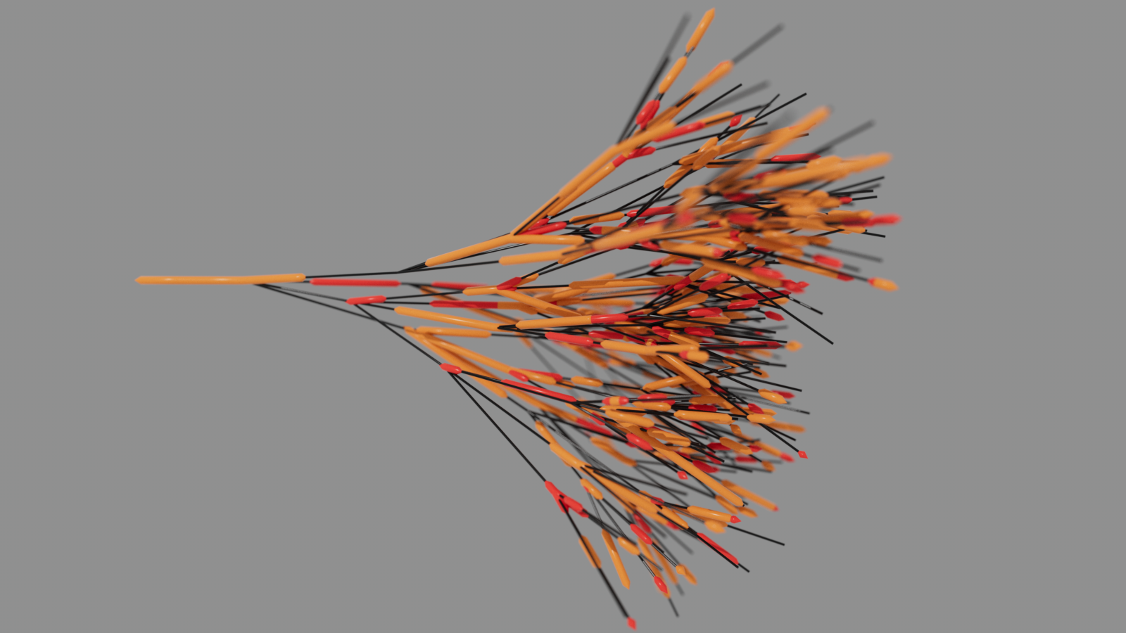 Hier wurde ein MoSpline-Objekt zur Erzeugung einer verzweigten Struktur genutzt. Zwei verschiedene Pulse Spline Modifier-Assets erzeugen und bewegen dabei farbige Spline-Stücke über diese Struktur.