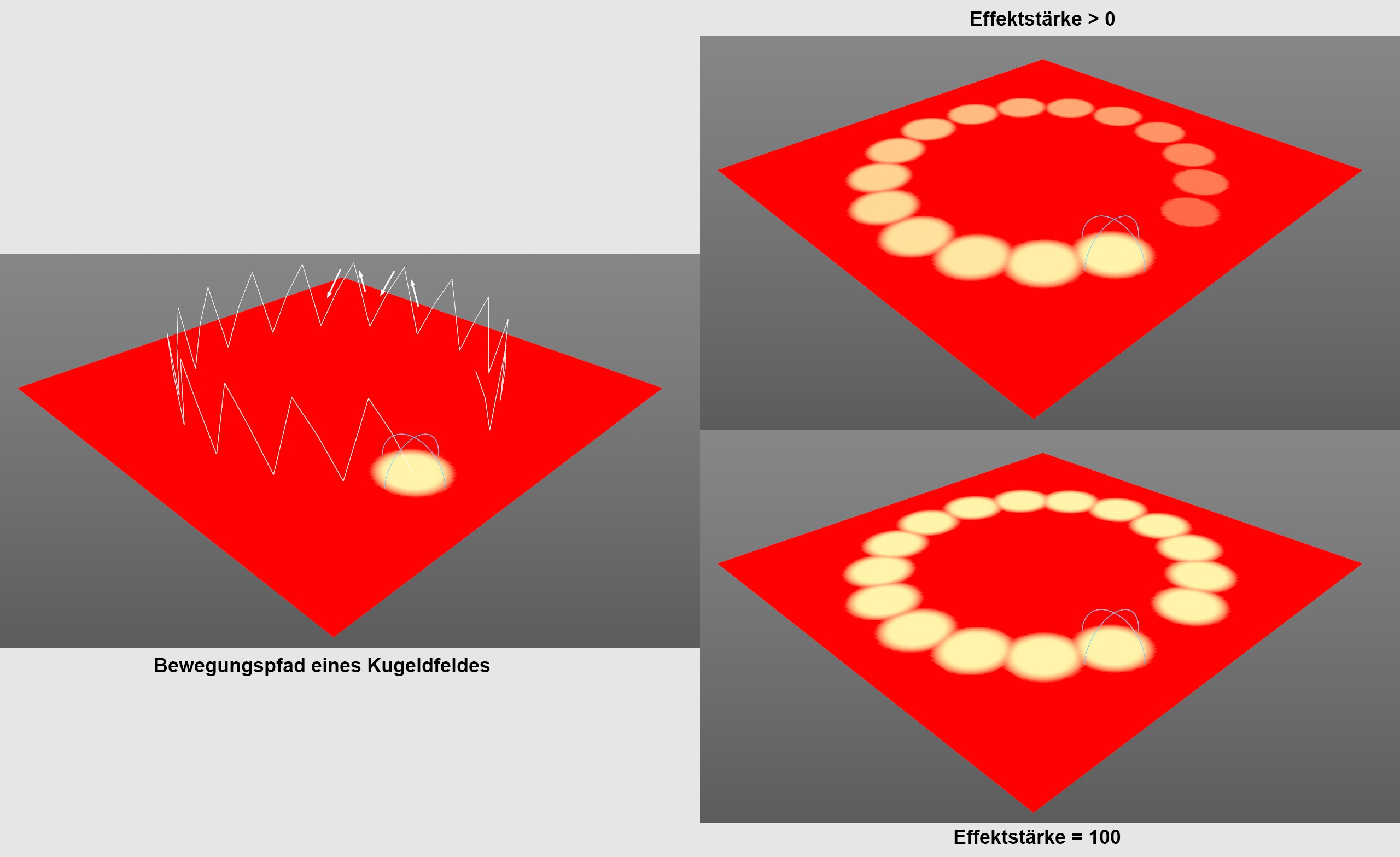 Ein Kugelfeld hinterlässt seinen Fußabdruck auf einer Vertex-Map mit links abgebildetem Bewegungspfad (ohne Abklingenebene). Rechts mit Abklingenebene bei verschiedenen Geschwindigkeiten.