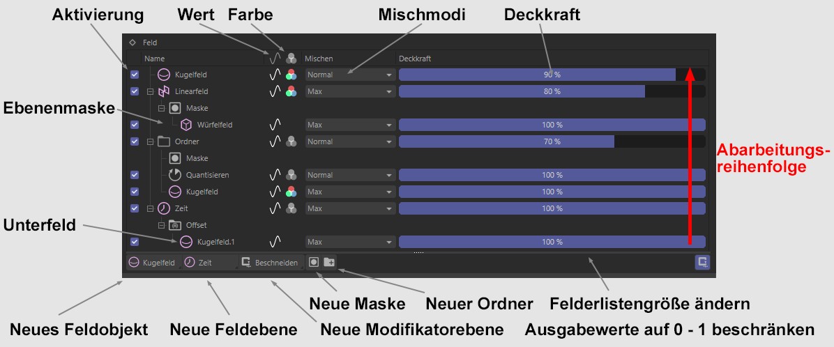 Sie finden in der Felderliste alle Feldebenen, Modifikatorebenen und Ordner in Ebenen organisiert, die von unten nach oben (genauso wie Ebenen untergeordnet in Ordnern) abgearbeitet werden. Das Mischen der Elemente funktioniert ähnlich wie das von Ebenen in einem Bildbearbeitungsprogramm. Jede Ebene hat einen Mischmodus samt Deckkraftregler, die definieren, wie mit den untergeordneten Elementen gemischt werden soll.