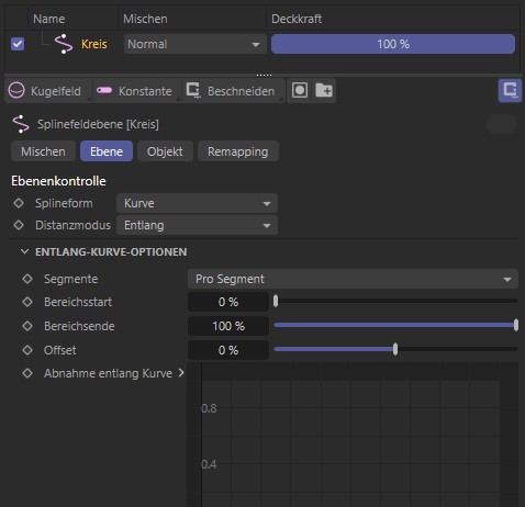Die Felderliste hat die Fähigkeit, zusammengesetzte Elementeigenschaften anzuzeigen. Beispiel: Sie ziehen einen Kreis-Spline in die Felderliste. Die Ebene "Kreis" wird weiter unten im Dialog mit 5 Tabs angezeigt, wovon das Tab "Objekt" direkt vom Spline übernommen wird (sodass Sie bequem Kreiseinstellungen ändern können, ohne im Objekt-Manager den Kreis-Spline selektieren zu müssen). Das Tab "Ebene" enthält dabei die eigentlichen Einstellungen der Feldebenen-spezifischen Einstellungen. Die anderen Tabs "Mischen", Remapping" und "Farbremapping" sind allgemeine Felderlisten-Ebeneneigenschaften, deren Eigenschaften wiederum von anderen – unsichtbaren – Objekten (s.a. Andere Objekte) gestellt werden.