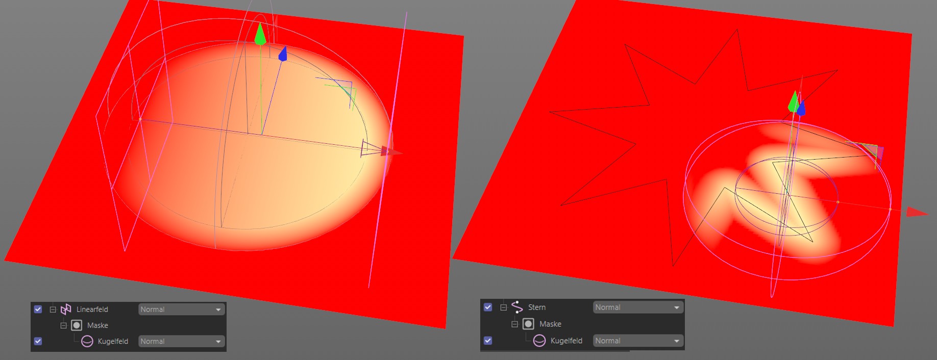 Hier wird jeweils eine Vertex-Map von einem Linearfeld (links) bzw. einem Splinefeld (rechts) definiert, wobei jeweils ein Kugelfeld als begrenzende Maske dient.