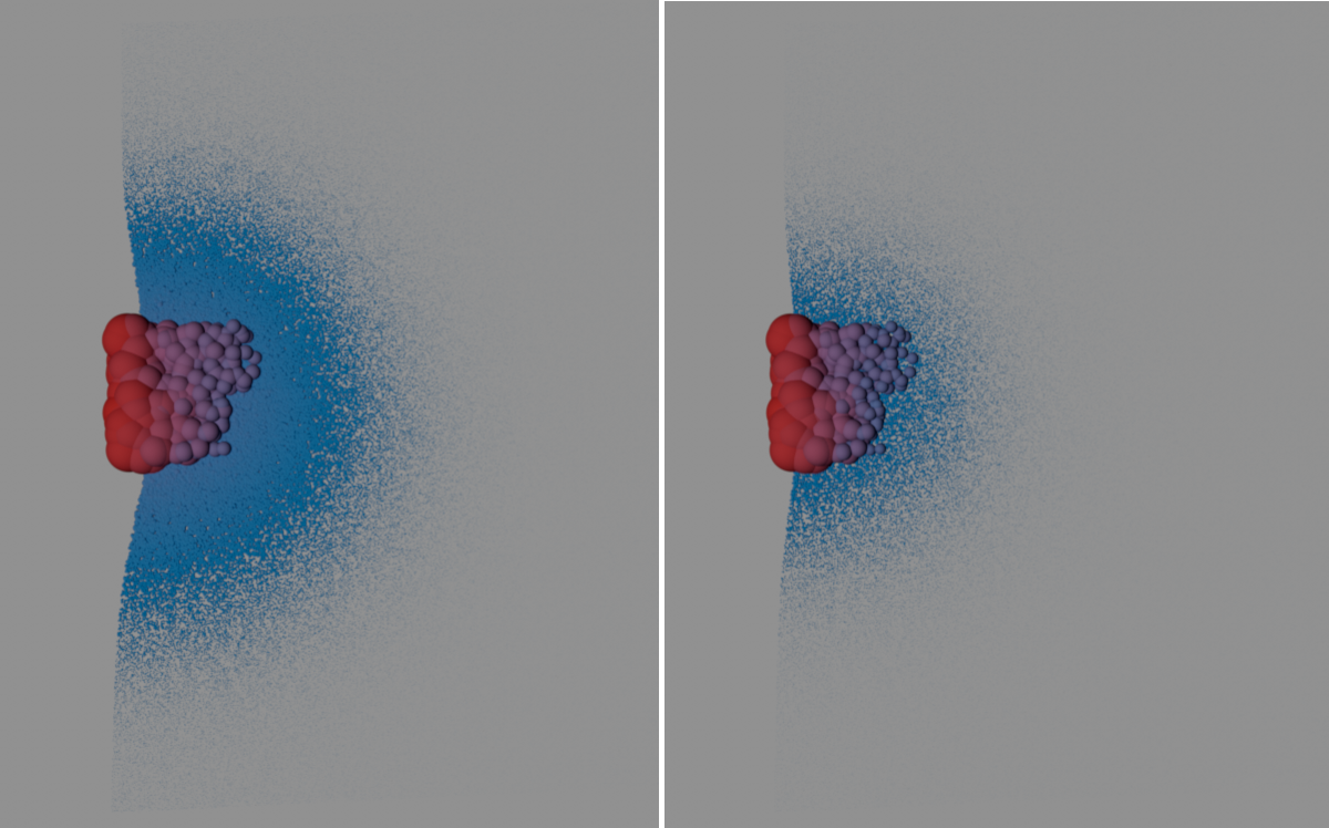 Hier werden rote Partikel seitlich auf statische, blaue Partikel emittiert.Beide Partikel-Arten werden über Mischen-Modifikatoren bezüglich der Farben, Radien und Geschwindigkeiten überblendet. Links wird Nachbarschaftssuche Fest und rechts Voll verwendet. Bei Voll werden immer alle Partikel in die Berechnung einbezogen, weswegen dies die aufwändigste, aber auch genaueste Berechnung darstellt.