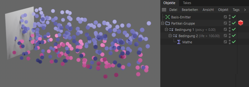 Obige Abbildung zeigt einen Basis-Emitter mit einer einzelnen Bedingung in seiner Gruppe. Diese fragt das Alter der Partikel ab und überprüft, ob dieses Größer gleich 0 ist. Als Wahrscheinlichkeit wurden 2 % verwendet. Das bedeutet, dass in jedem Animationsbild 2% aller Partikel aussortiert werden und über einen Mathe-Modifikator rötlich umgefärbt werden. Theoretisch könnten damit alle Partikel nach 50 Bildern rot eingefärbt sein, wobei sich ein gleichmäßiger Verlauf zu den neu entstandenen Partikeln ergibt.