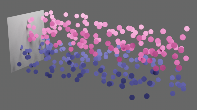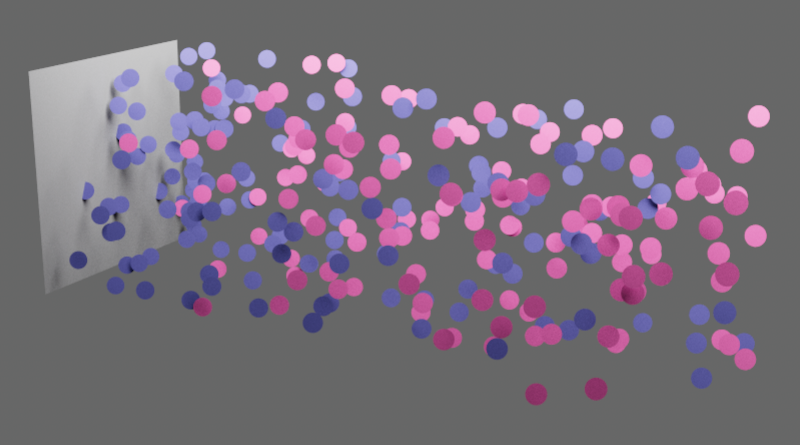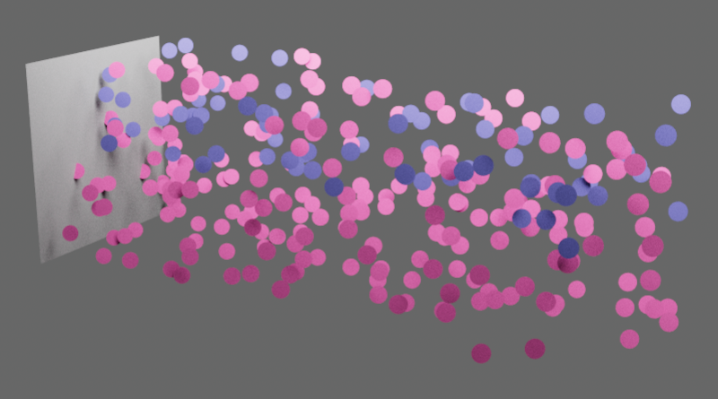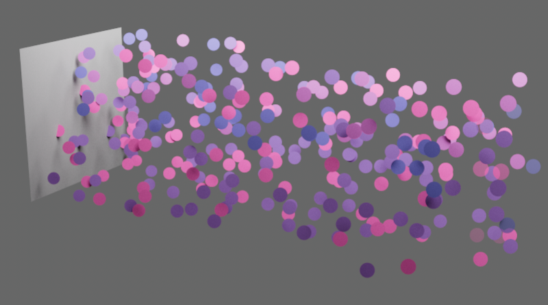 Über diesen Wert lässt sich eine zufällige Auswertung der Bedingung hinzumischen. Bei 100% ist jeglicher Zufall ausgeschaltet und nur der Vergleich und die vorgegebenen Werte werden verwendet. Bei einer Wahrscheinlichkeit unterhalb von 100% nimmt der zufällige Anteil der Partikel zu, der durch die Bedingung verarbeitet wird. Bei einem Wert von 25% wird also nur noch ein Viertel der Partikel von der Bedingung verarbeitet. Diese Einstellung kann daher auch zur zufälligen Auswahl von Partikeln genutzt werden, wenn Sie eine Partikel-Eigenschaft mit einem Vergleich kombinieren, durch den normalerweise alle Partikel durchgeleitet werden (z. B. die Bedingung, dass das Alter der Partikel Größer gleich 0 sein muss). Aber Achtung: Sie müssen bedenken, dass die Bedingung in jedem Animationsbild erneut abgearbeitet wird. Partikel, die durch eine niedrige Chance vielleicht zunächst nicht durchgeleitet wurden, können dann zu einem späteren Zeitpunkt der Animation dennoch ausgewählt werden. Das kann dann wie im folgenden Bild wirken: