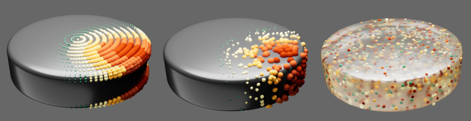 Links ein Beispiel für die Nutzung der Punkte, in der Mitte die Emission entlang der Oberfläche und rechts die Nutzung des Volumens für die Emission.