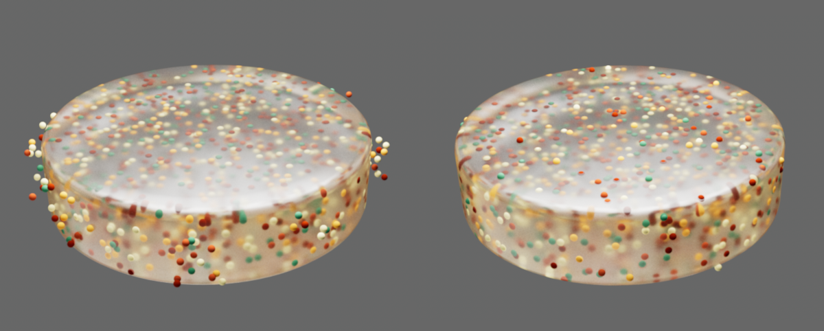 Links ein Versuch, rechts 10 Versuche, um Partikeln eine zulässige Position in einer Noise-Struktur zu geben. Durch die höhere Versuche-Anzahl steigt die Wahrscheinlichkeit an, dass die ursprünglich gewählte Anzahl an neu zu erzeugenden Partikel erzielt wird.