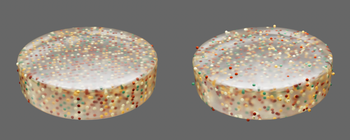 Links eine Volumen-Emission von Partikeln in einem regelmäßigen Gitter, rechts zufällig.