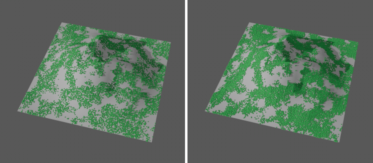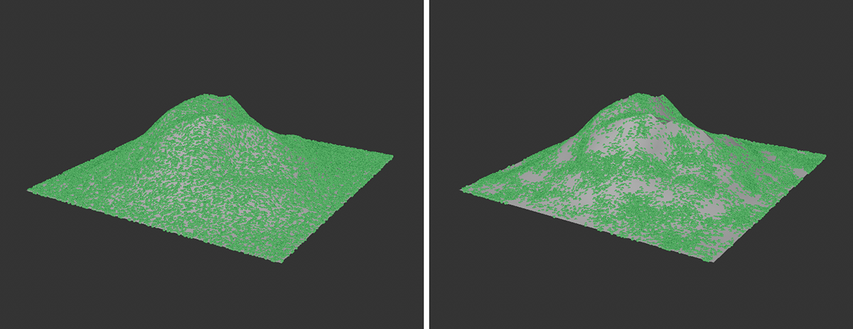 Links ein Beispiel für die gleichmäßige, rechts ein Beispiel für eine Noise-Dichteverteilung auf einer zugewiesenen Landschaftsgeometrie.