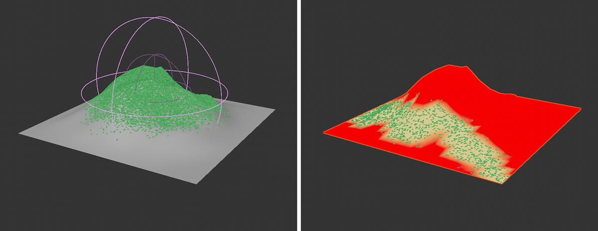 Links ein Beispiel für eine Feld-, rechts ein Beispiel für eine Vertex Map-Dichteverteilung auf einer zugewiesenen Landschaftsgeometrie.