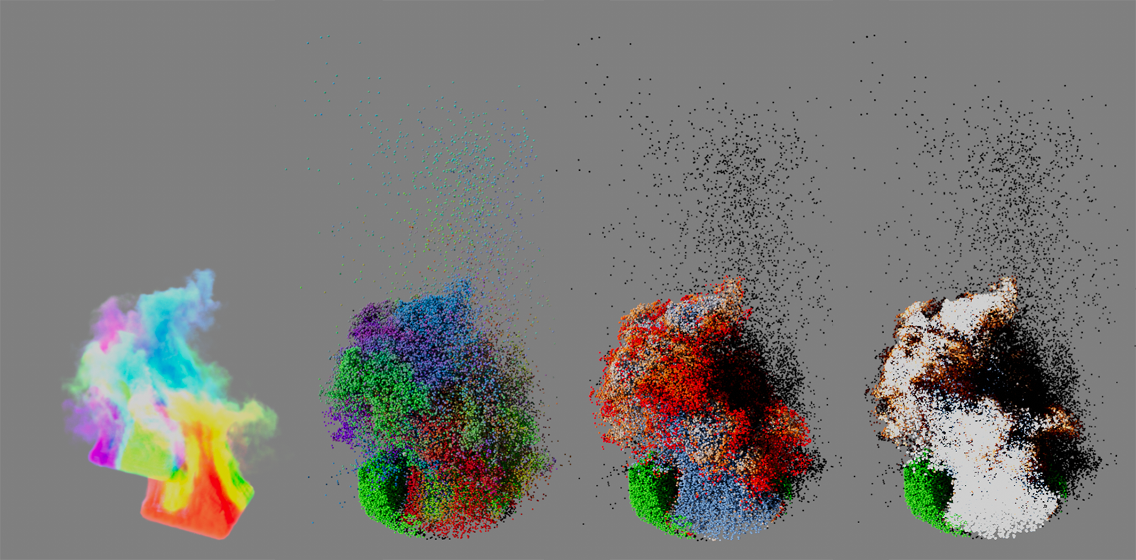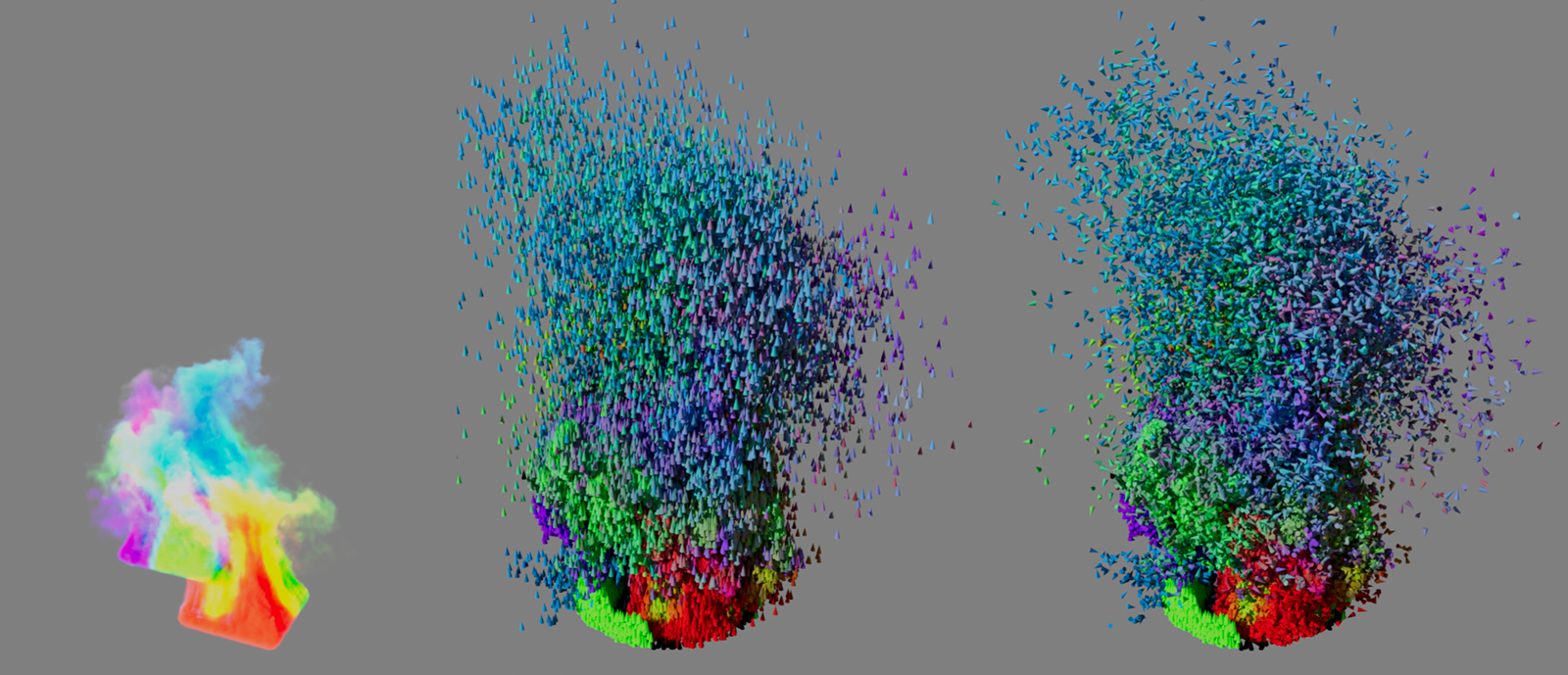 Links ist die ursprüngliche Pyro-Simulation mit unterschiedlich gefärbten Emitterflächen zu sehen. In der Mitte wurden kleine Kegel als Partikel verwendet und über den Modifikator eingefärbt. Dabei bleib die Ausrichtung zunächst unverändert. Rechts wurde dann für die Partikel die Ausrichtung entlang des Dichteverlaufs aktiviert. Die Kegel richten sich nun entsprechend innerhalb der Simulation aus.