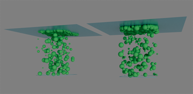 Hier treffen Partikel mit variablen Radien von unten auf eine Ebene. Links das Ergebnis bei ausgeschalteter Berücksichtigung der Radien, rechts mit.