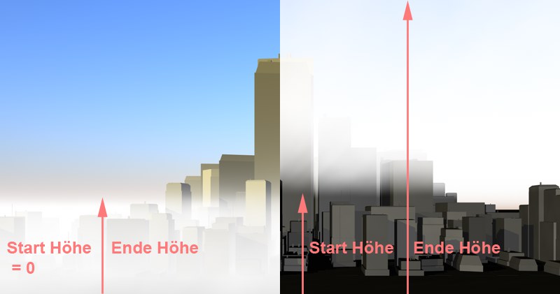 Seitliche Stadtansicht, links mit0 "Start Höhe"=0, d.h. der Nebel beginnt am Boden, rechts mit "Start Höhe" > 0, jeweils mit stark abnehmendem "Dichteverteilung".