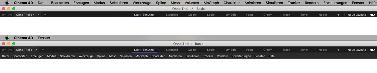 Cinema 4D kann seine Hauptmenüleiste jetzt Apple-konform in der macOS-Menüleiste unterbringen (Option aktiviert: obere Abbildungshälfte) oder wie von älteren Versionen gewohnt, selbst in seiner Oberfläche einblenden (Option deaktiviert: untere Abbildungshälfte).