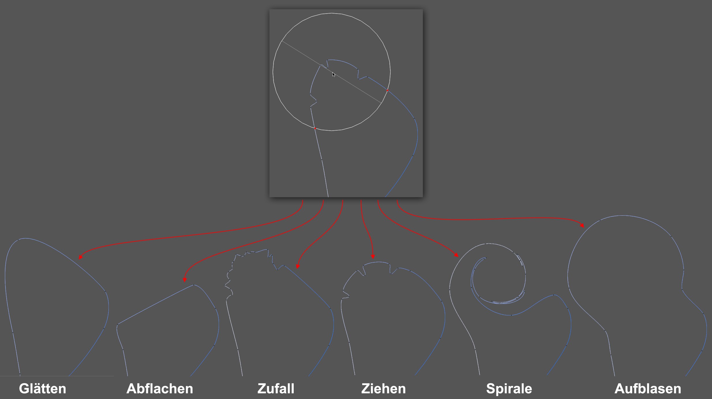 Tatsächlich kann das Werkzeug damit als eine Art Formpinsel verwendet werden, was Ihnen Splinemanipulationen auf vielfältige Arten ermöglicht.