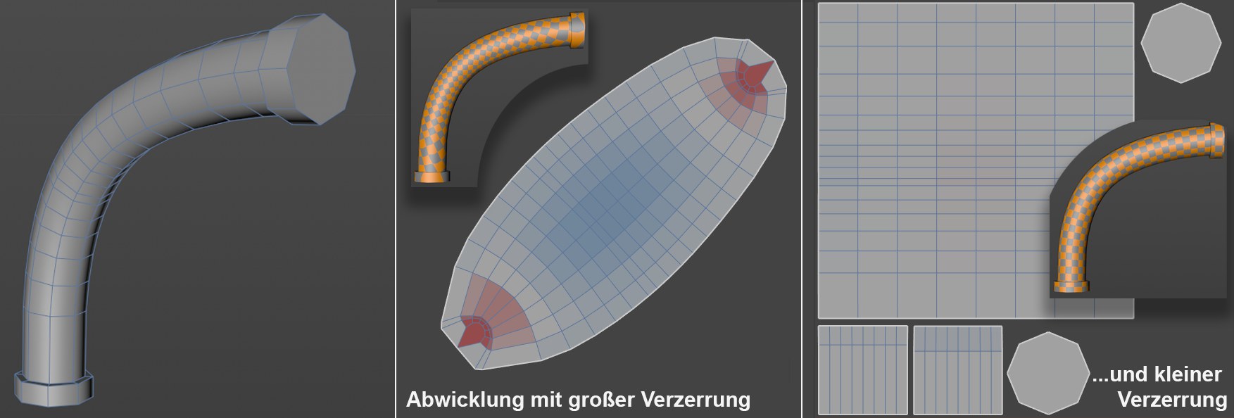 Ein abgewickeltes Rohr, Mitte: nur eine UV-Insel, aber große Verzerrung, rechts viele UV-Inseln, aber nahezu keine Verzerrung.
