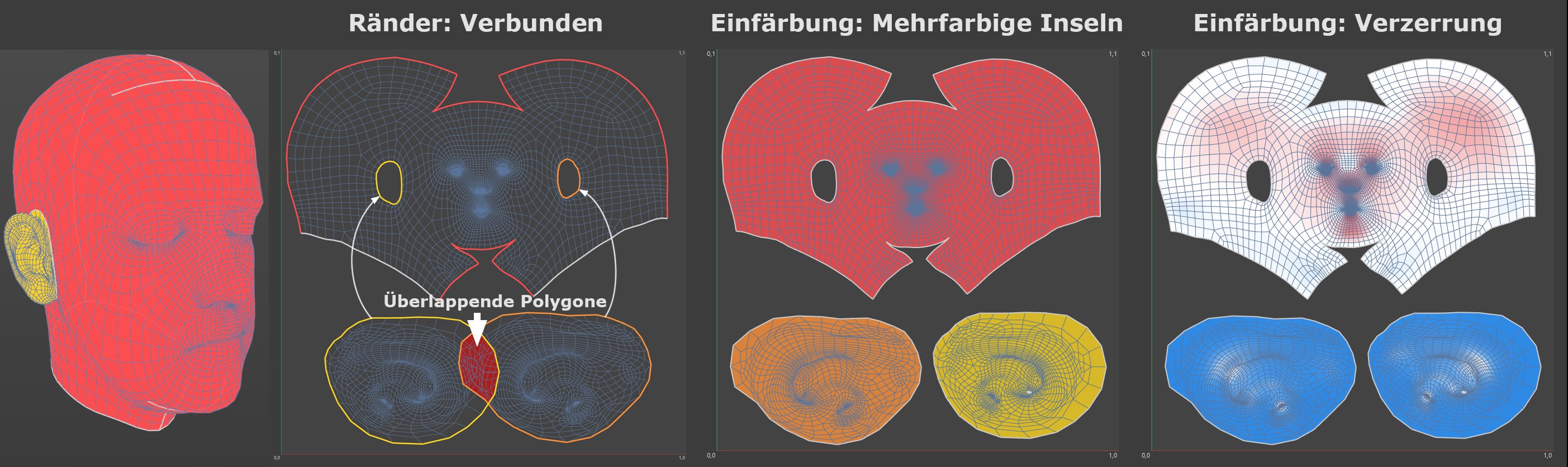 Verschiedene UV-Einstellungen bei einem abgewickelten Kopf-UV-Mesh.