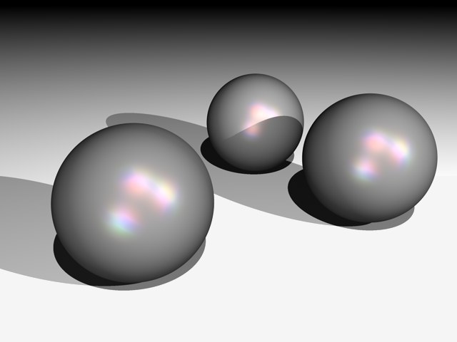 Der Spektral-Shader ist die richtige Wahl für prismatische oder irisierende (schillernde) Farbeffekte, wie sie beispielsweise auf CDs, Perlen oder anderen perlmuttartigen Materialien zu finden sind. Die Berechnung dieses Effektes bezieht die Kamera-Blickrichtung und den Winkel der Oberfläche zur Lichtquelle mit ein.
