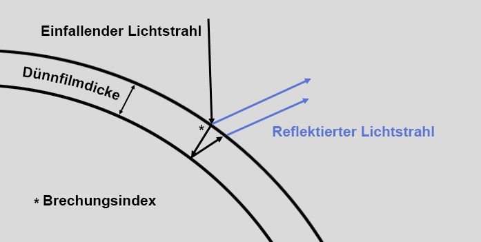 Sicherlich haben Sie sich schon gefragt, warum z.B. Seifenblasen, Ölfilme auf Wasser, Perlmutt etc. in allen Farben des Spektrums schillern. Der Grund ist ein spezieller, physikalischer Effekt, den man als Dünnfilm- oder auch Interferenzeffekt bezeichnet. Dieser Effekt tritt überall dort auf, wo es sehr dünne, transparente Schichten mit einer ungefähren Dicke in den Dimensionen der Wellenlänge des sichtbaren Lichts (um 500 nm herum) gibt. Das Licht wird dabei von Vorder- und Rückseite des Films reflektiert: