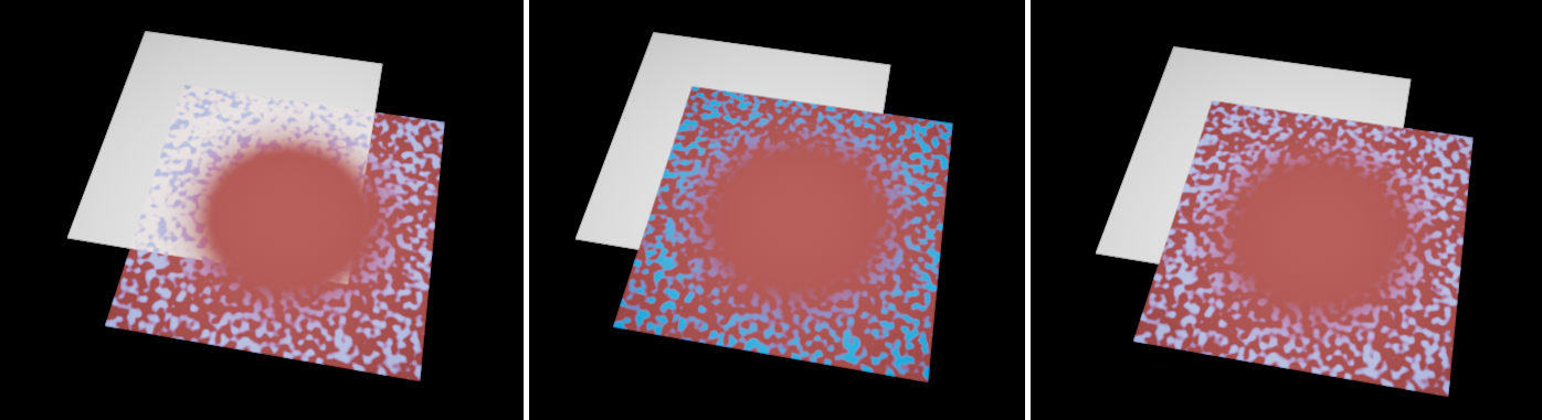 The three Blend Types 'Combine', 'Over' and 'Add' (from left to right). In these examples a 'Ramp' node with a 'Circular' gradient was used as a 'Layer Material Mask'.