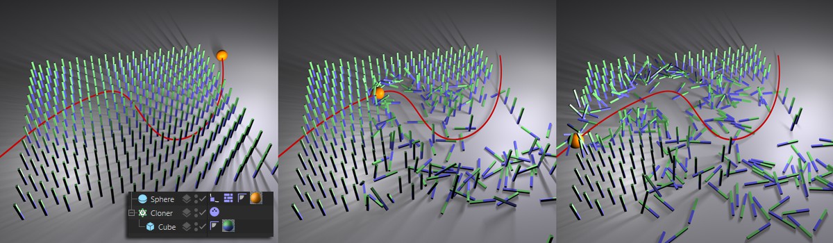 The sphere is animated to move along the path. In doing so it collides with the pillars.