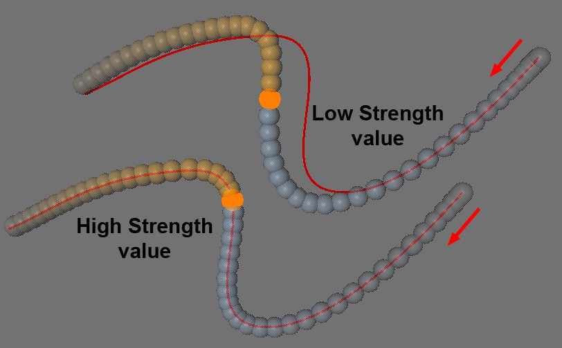 Imagine a spring lies between the position animated in the Timeline and the object. The strength represents the tension of the spring - a measure of the strength of the connection between both elements.