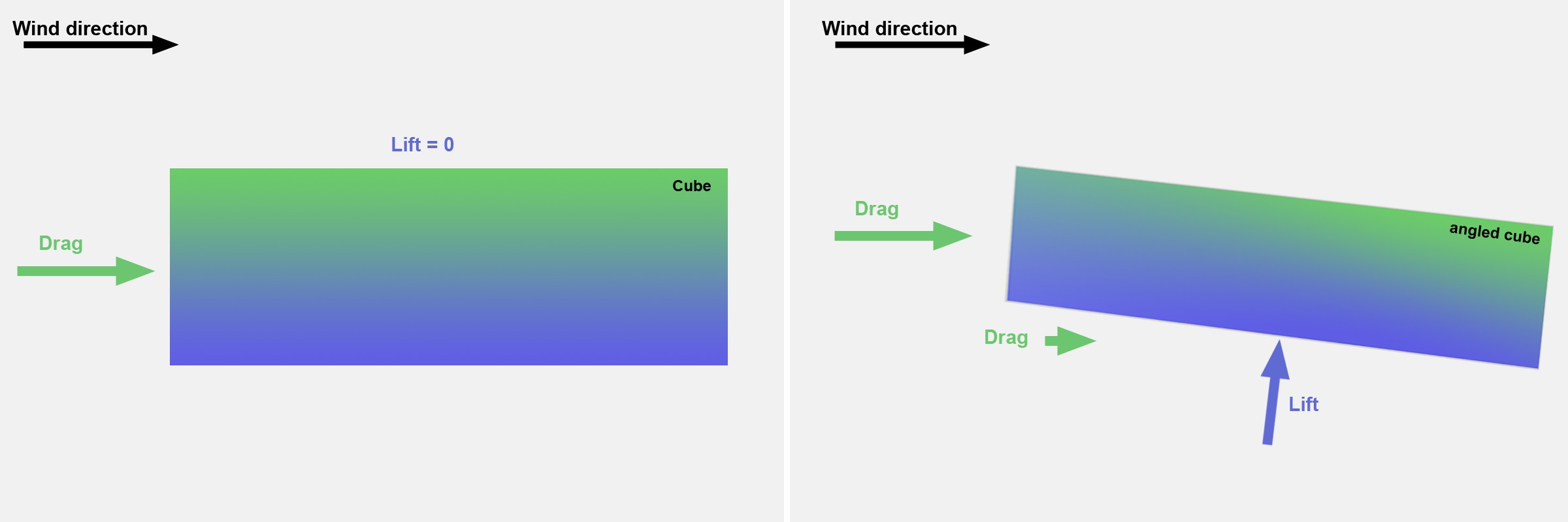 The lift effect basically exerts its force in the direction of the surface Normals. The wind must have a surface on which it can exert its force. Surfaces not facing the wind and polygons lying parallel to the wind will be ignored. Hence, if a surface is facing the wind a lifting or downward force will be exerted. The value defined here works as a multiplier for the forces at work.