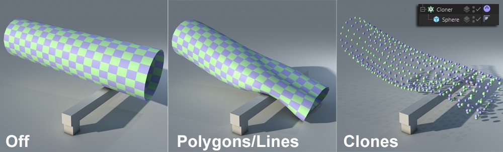 - Made of Clones: Groups of clones (e.g., as they are generated by a Cloner object) can be linked with Springs exactly like a Soft Body