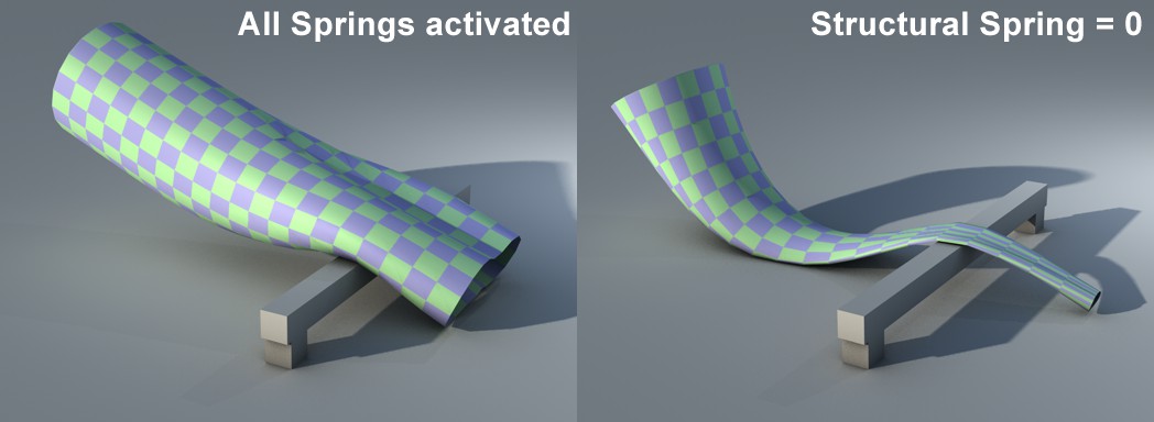 A Spring will be attached to each object point that connects it with all neighboring points along the polygon edge. The value defines the stiffness of the Spring. The harder the Spring the greater the stiffness. How this Spring works can best be seen if Structural is set to 0: