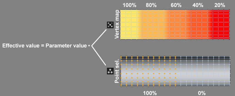 The Map setting (Point Selection tag or Vertex maps) lets this be adjusted on point level. The following applies for point selections: