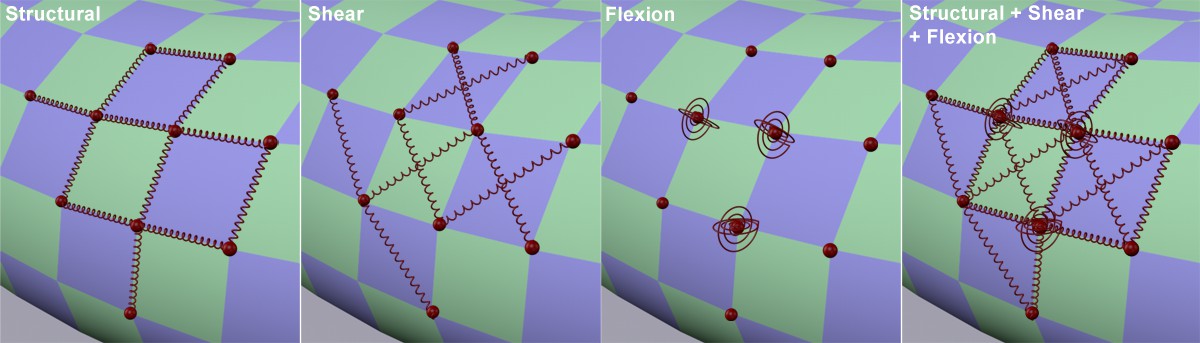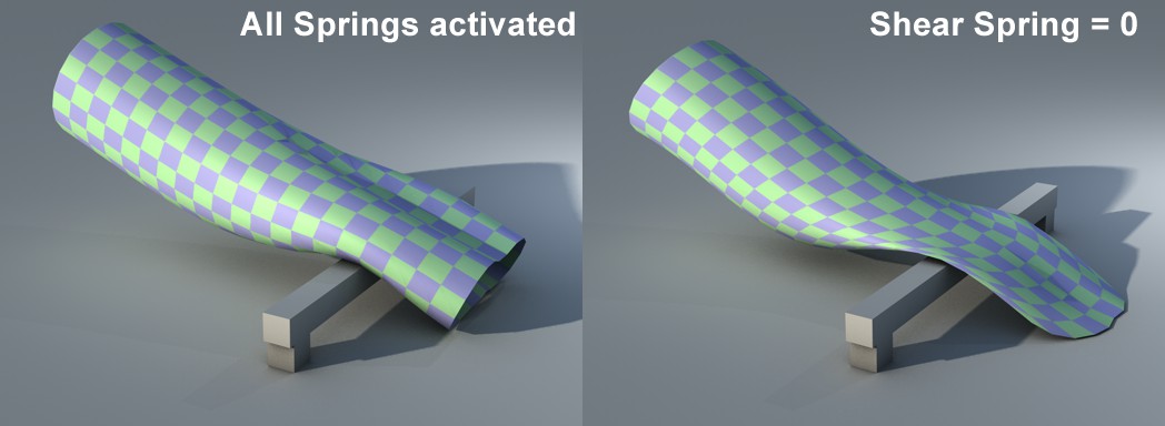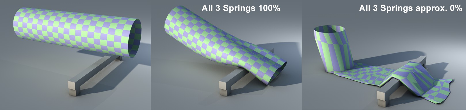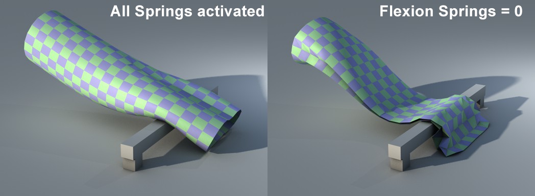 In contrast to the other Springs, the Flexion Springs are not linear Springs. They are torsion Springs that lie on each object point and try to maintain angular continuity - depending on Spring strength - along neighboring edges. This lets flexure be adjusted independently of the object's stretch behavior (this was different in Dynamics versions prior to R11.5 where linear Springs were used, which were affected by the object's stretch behavior). The value defines the stiffness of the Spring. The greater the value the harder/stiffer the Spring.