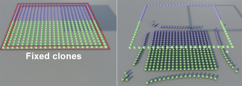 Note that the Cloner object's Individual Elements should be set to Top Level. You can fixate individual clones in a conglomerate of clones using the MoGraph selection (see Dynamic).