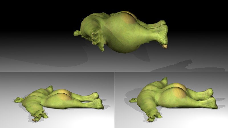 Flabio belly-flops onto the ground. At left a lesser stiffness than at the right. Shown here is the (very short) rest state before he bounces back up.
