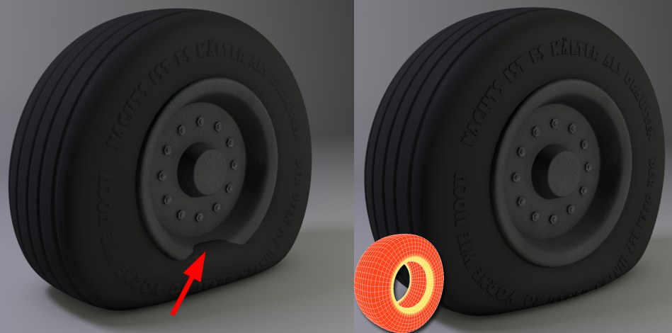 This lets you easily stiffen specific regions of a Soft Body, as in the example below. The tire should deform accordingly when it loses pressure. Points on the tire were weighted, with the maximum weighting at the edge of the wheel rim (yellow). This is where the Shape Conservation is at its strongest. Hence, the tire will not deform near the wheel and will not penetrate the wheel (which itself is not a Soft Body).