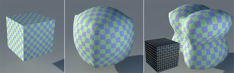 The cube at the left is inflated resulting in the shape at the center. At right a Point Selection tag was added to the Stiffness parameter.