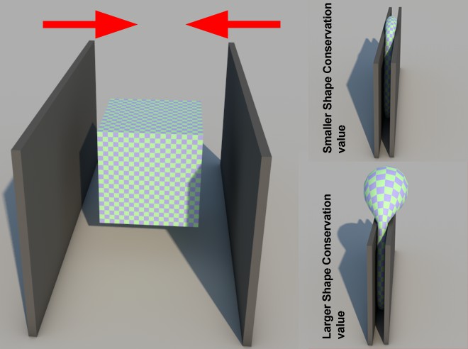 The Volume Conservation feature applies a force in an attempt to maintain the volume of an object. If the current volume is greater than the volume in rest state the force is directed inwardly and vice-versa. The strength of this force is defined by the Volume Conservation value.