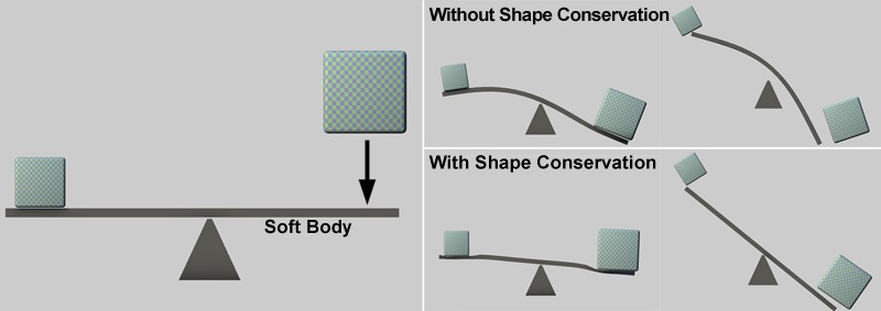 Shape Conservation maintains for the most part the shape of the Soft Body as a whole dependent on the Stiffness value (with the exception of a few brief, minor deformations by local collisions).