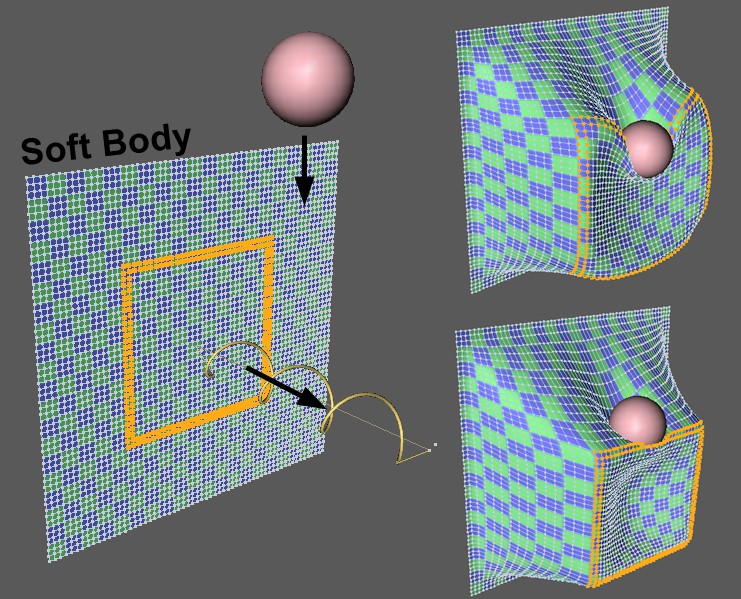 The Soft Body is more difficult. Each object point will be connected to other points via springs. If the force will be applied at just one point, the results can be unsightly. Here it is possible to initiate the effect over larger areas.