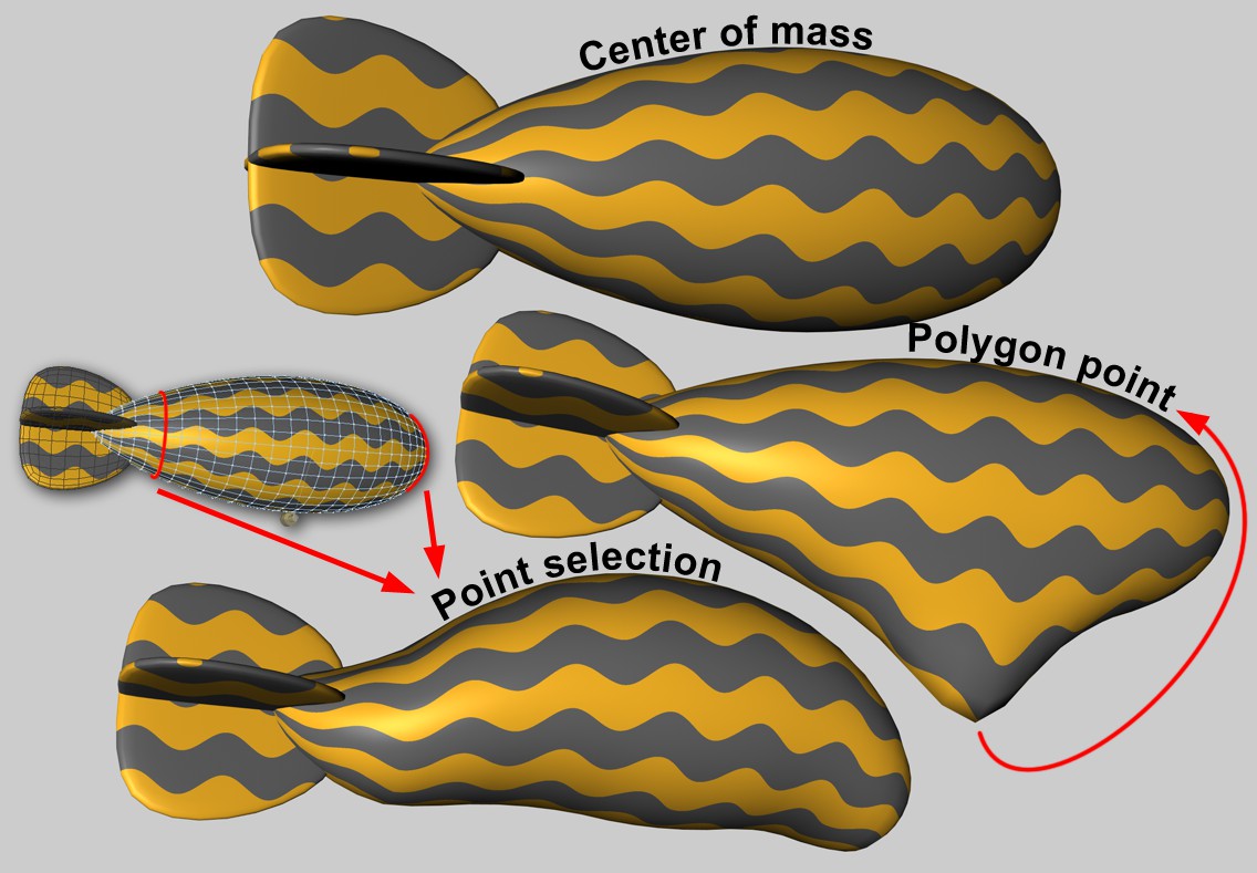 Forces can also be applied by map (Point Selection tag or vertex maps). There are then some additional parameters that regulate how much the shape of the selected (or weighted) points as a whole may change