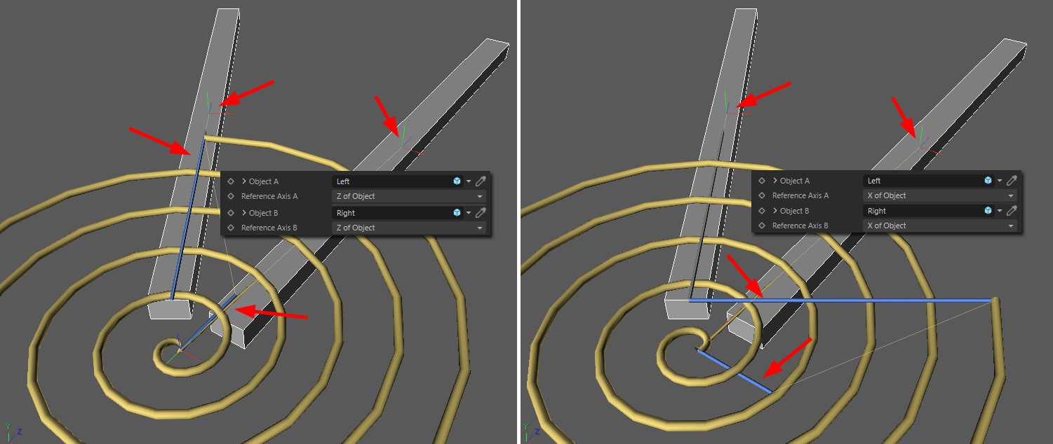 Note how the two blue "spring ends" are each aligned with the defined axis (of the linked objects). Object-Y axis would make little sense in this case.