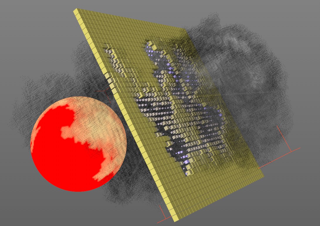 This Field creates a connection to the Volumes in Cinema 4D. Volume Builders, Volume Sets, Volume Objects, etc., can be applied directly in the Field list. Don't forget that objects that are made up of Voxels are grid-shaped objects that have a value for each Voxel. These values can be read ("sampled") by a Volume Object Layer and in turn create an effect using Effectors, Deformers, tags, etc.