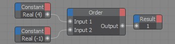Use this Node to determine which is the larger of two values. Possible outputs are 1 (first input is the larger value), -1 (second input is larger) and 0 (inputs are equal). Set the Node's data type in the Attribute Manager.