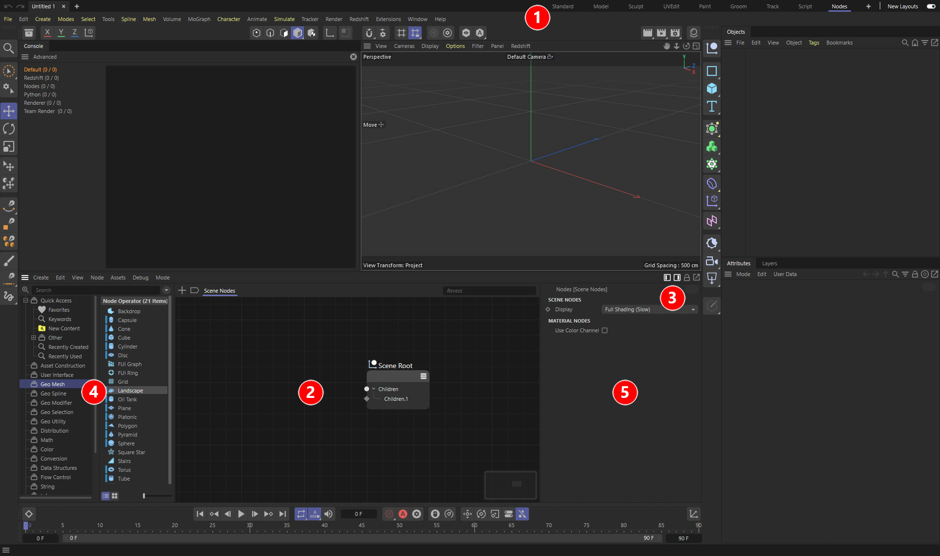 In the lower part of the Nodes layout you will find the Node Editor (see number 2), which can be framed on the left by the Asset Browser (see number 4) and on the right by the Attribute Manager (see number 5). These managers can be shown and hidden as required using the two icons in the title bar of the Node Editor (see point 3).