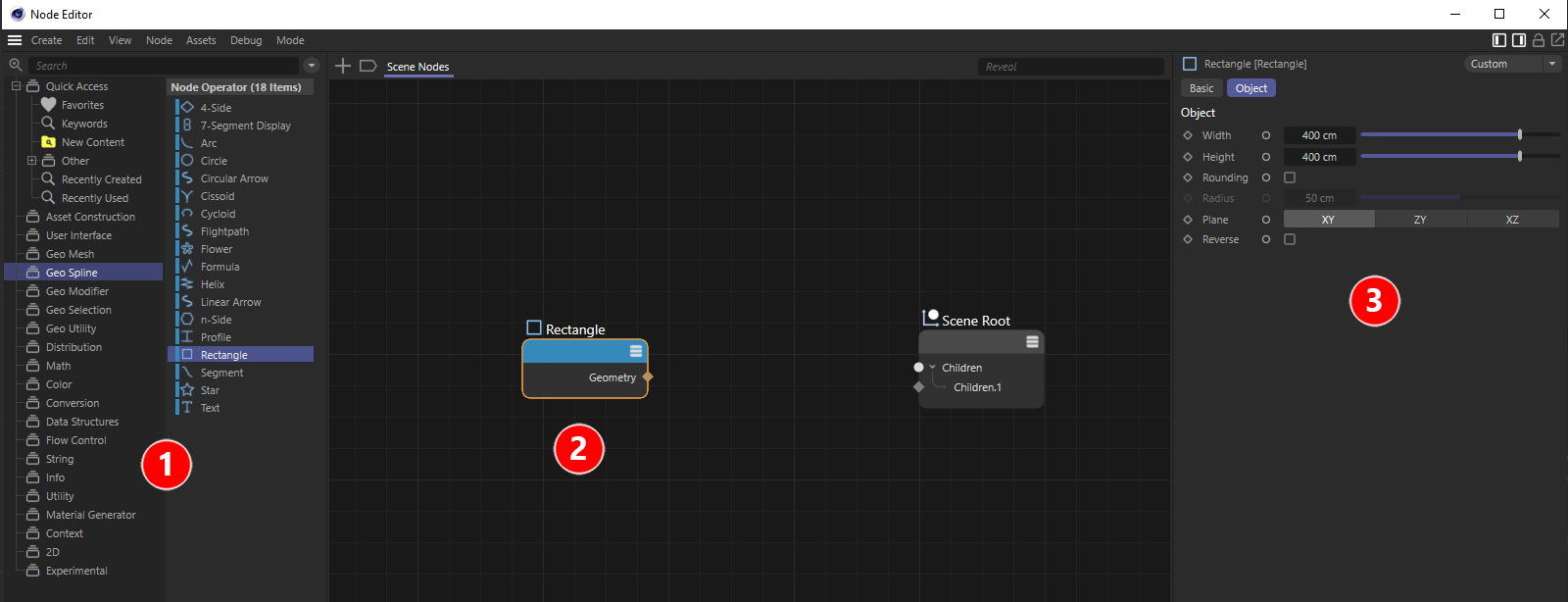 The following steps will present the creation of a typical Scene Node setup. Through this, a Rectangle spline is to be created, individually rounded and finally converted to a polygon object through extrusion. To do this, we navigate to the Geo Spline category in the Asset Browser. The Nodes in this group calculate spline shapes, some of which you already know from the classic Cinema 4D environment, such as the Rectangle spline. Drag this Rectangle entry from the Asset Browser (see number 1 in the following figure) to the center Node Editor area. This creates a Rectangular spline Node (see number 2). In the Attribute Manager you will find the corresponding settings for this (see number 3).