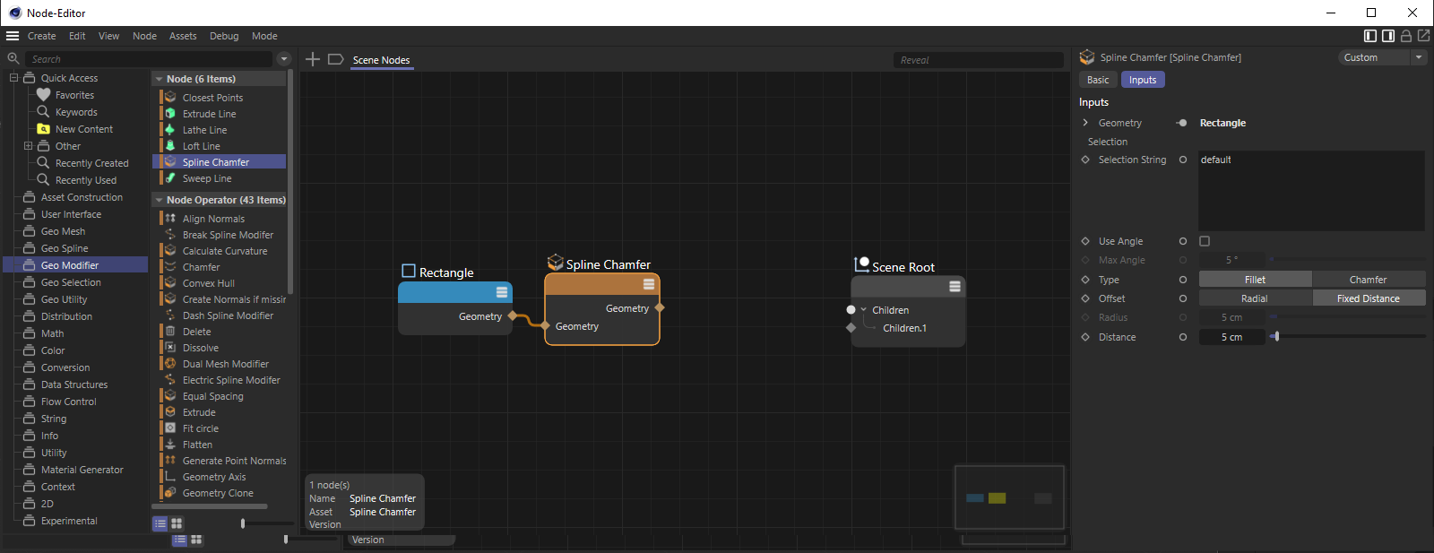 To process the geometry of the Rectangle spline, you can use the Nodes from the Geo Modifier category. We look for the Spline Chamfer Node there and drag it from the Asset Browser to the right of the Rectangle Node. The Geometry output of the Rectangle spline must be connected to the input of the same name of the Spline Chamfer Node so that these Nodes can exchange data and communicate with each other. Nodes without connections are automatically inactive.
