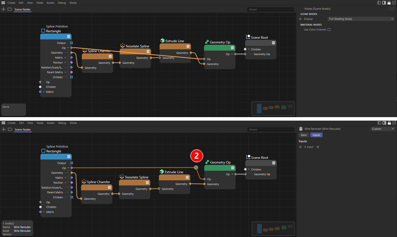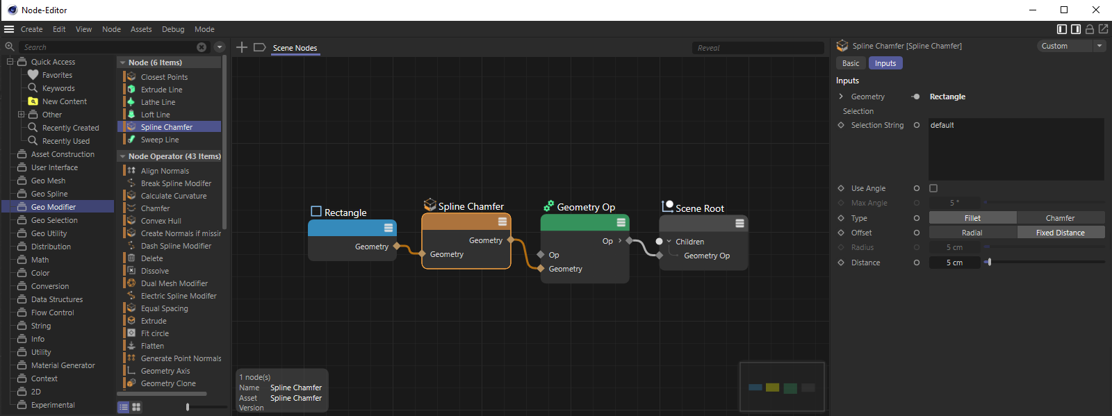 As you can see from the figure above, the Spline Chamfer Node again offers settings in the Attribute Manager that can be used, for example, to define the type of rounding. As before, however, nothing of the spline is visible in our viewports. This is because the geometry has not yet been sent to our scene. The Scene Node, which was already included in the NodeEditor from the beginning, is always responsible for this. So draw a connecting line from the Geometry output of the Spline Chamfer Node to the Children.1 input of the Scene Node .