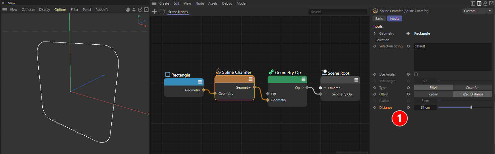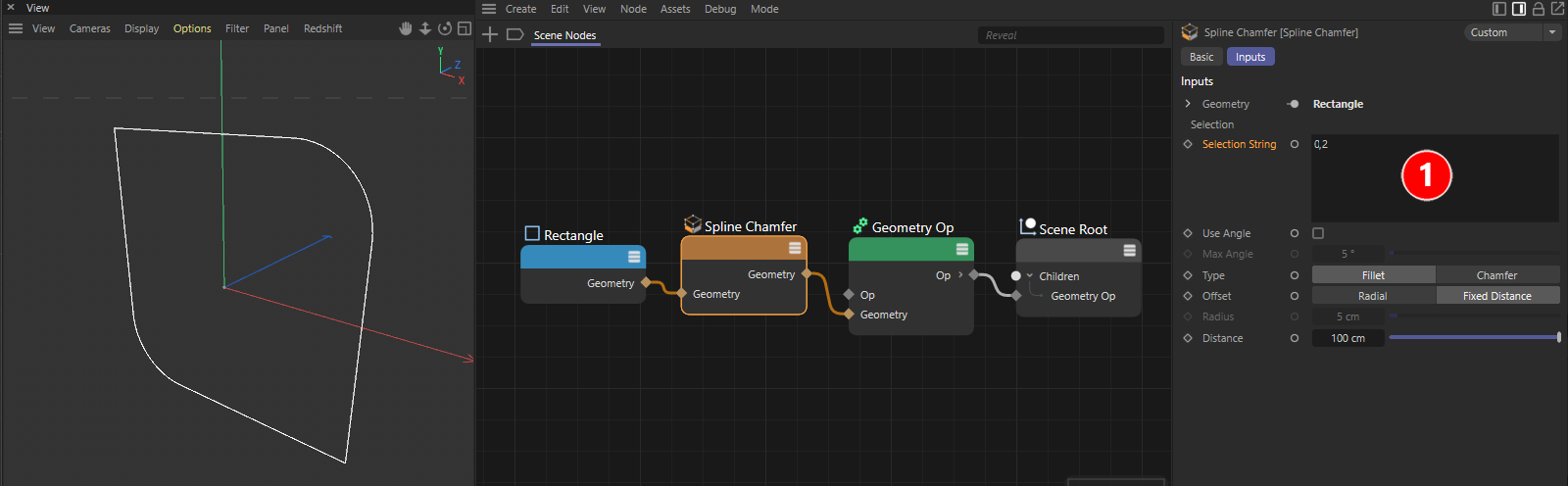 If you now select the Spline Chamfer Node, you can change the Distance value for the rounding of all corner points of the spline in the Attribute Manager, for example (see number 1 in the figure above). This alone would not be that interesting, since the Rectangle spline itself already offers a parameter for Rounding. However, Spline Chamfer can also be restricted to only a part of the rectangle, i.e., to a selection. For this purpose, you can either connect a so-called array with the desired point numbers to the Selection input or you can directly use the field for the Selection String in the Attribute Manager for this purpose (see the following figure).