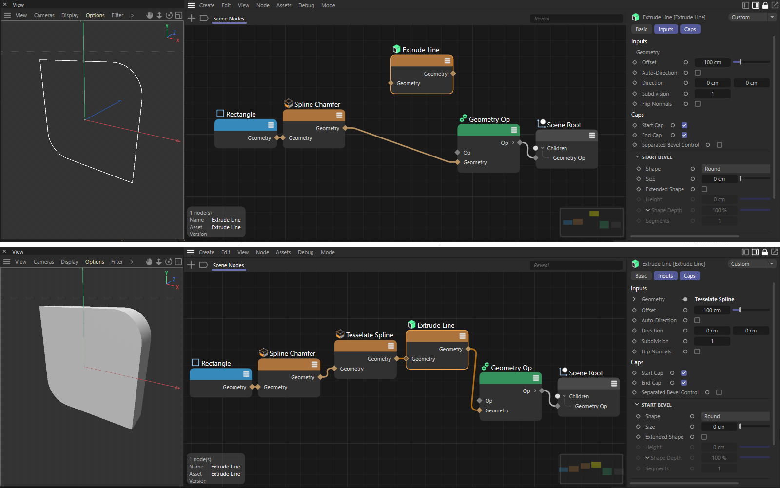 This happens automatically when you connect the output of the Extrude Line Node to the Geometry input of the Geometry Op Node, because each input can only be associated with one connection at a time. Therefore, dragging the new connection to this input automatically removes its old connection to the Spline Chamfer Node. Otherwise, you can also double-click on a connection at any time to delete it. The result of this action can be seen in the following figure.