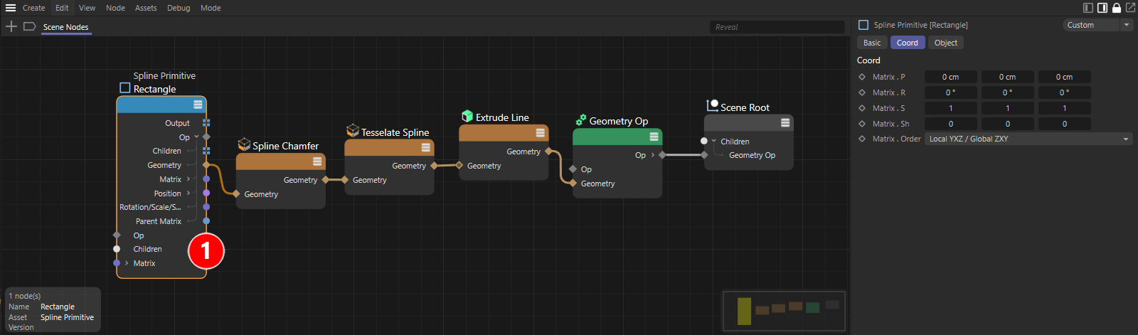 What is still missing, however, is a simple option to be able to move or rotate the object, for example. This is because in our setup we only work with the Geometry and do not associate any Matrix information with this geometry. A matrix defines e.g., the position, size and rotation angles, as you are used to from the Coordinates section of classical objects. This information can also be quickly added to our setup.