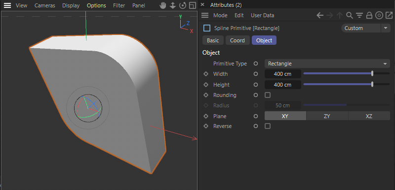 As shown in the following figure, you can now not only control the position of the rectangle directly at the rectangle Node by entering new Coordinates, but also select the rectangle in the viewports by clicking on it and move or rotate it directly with the usual tools. The Attribute Manager then also displays the parameters of the rectangle, which include the Coordinates. So the Node Editor is only needed if you want to work on the settings of e.g., the Spline Chamfer or Extrude Line Node.
