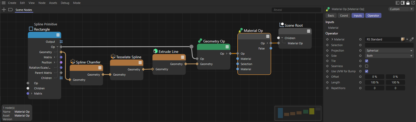 Assigning a material is also possible in the Node Editor. The Material Op Node is available to you for this purpose. This has an Op-input, so in our setup it must be supplied with data by the Geometry Op Node. If you switch the Material Op Node in front of the Scene Node, as shown in the following figure, the desired material can be linked in the Material Op Node by drag&drop from the Material Manager and the Projection can be set as usual from the Material Tag.